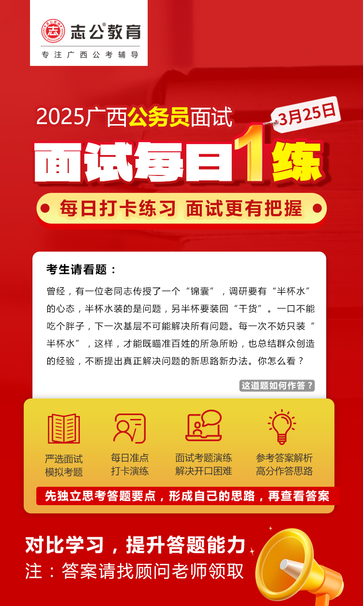 廣西區(qū)考面試準(zhǔn)備需緊扣本土特色,強化邏輯表達和實務(wù)能力,同時注重細(xì)節(jié)(如資格復(fù)審材料、禮儀)。建議從現(xiàn)在起每天練習(xí)2-3套題,持續(xù)積累廣西熱點案例,爭取面試高分!資料已經(jīng)為大家準(zhǔn)備好了,快去看看吧!