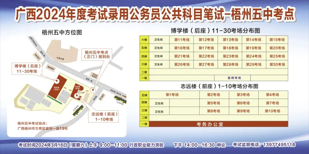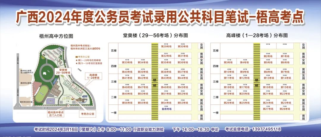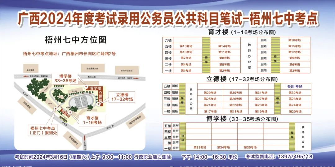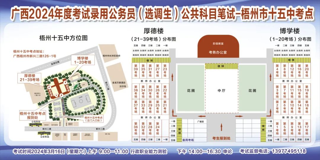 一、廣西2024年度考試錄用公務員(選調生)公共科目筆試將于3月16日舉行,梧州考區(qū)共設置9個考點,請考生提前熟悉各自考點位置、周邊環(huán)境及交通情況,考試當天提前出門做好準備,準時參加考試。特別提示:因考點停車場地有限,所有考生車輛不得進入考點,請考生規(guī)劃好前往考點的交通方式和路線。