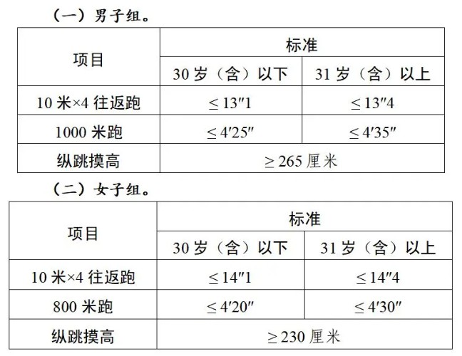 根據(jù)中共中央組織部辦公廳、公安部辦公廳印發(fā)的《公安機(jī)關(guān)錄用人民警察體能測評(píng)項(xiàng)目和標(biāo)準(zhǔn)》(公政治〔2024〕60號(hào))文件精神,體能測評(píng)的項(xiàng)目和標(biāo)準(zhǔn)如下: