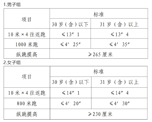 參加體能測評(píng)人員為筆試考試成績合格的考生。體能測評(píng)的標(biāo)準(zhǔn):參照《關(guān)于印發(fā)公安機(jī)關(guān)錄用人民警察體能測評(píng)項(xiàng)目和標(biāo)準(zhǔn)(暫行)的通知》(人社部發(fā)〔2011〕48號(hào))的標(biāo)準(zhǔn)。