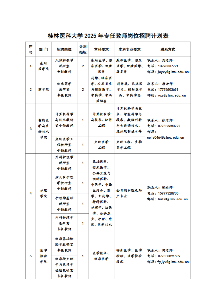 (二)各部門聯(lián)系方式見:桂林醫(yī)科大學各崗位招聘計劃表。