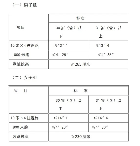 4.報(bào)考人員須參加全部三項(xiàng)體能測(cè)評(píng),全部達(dá)標(biāo)方為合格,如放棄一項(xiàng)則視為不合格,體能測(cè)評(píng)合格的方可進(jìn)入下一環(huán)節(jié)。