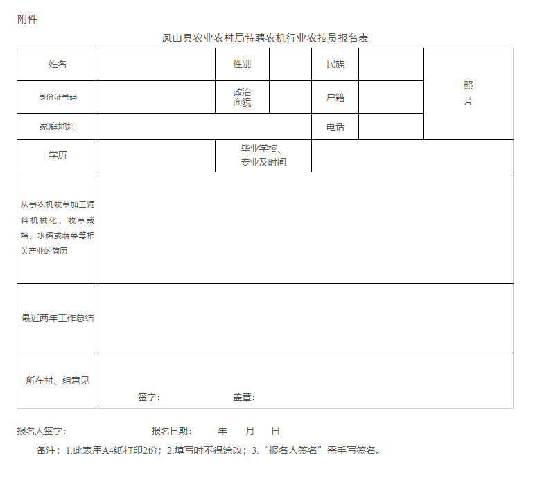 附件:鳳山縣農(nóng)業(yè)農(nóng)村局特聘農(nóng)機(jī)行業(yè)農(nóng)技員報(bào)名表