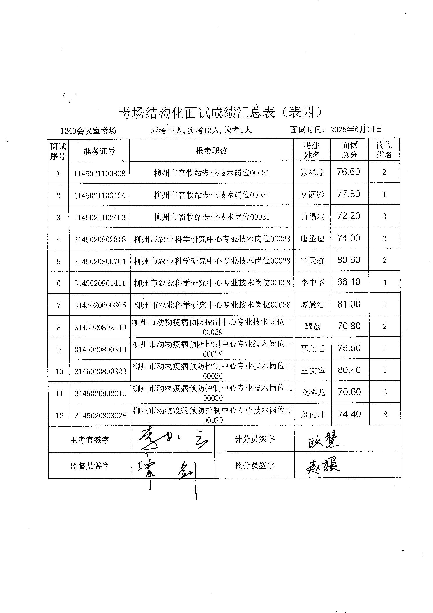 柳州市農業(yè)農村局2025年度上半年事業(yè)單位公開招聘面試成績