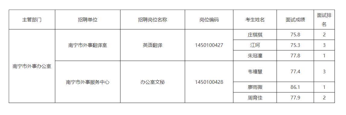 原文標(biāo)題:南寧市外事辦公室2025年公開考試招聘事業(yè)單位工作人員面試成績(jī)表