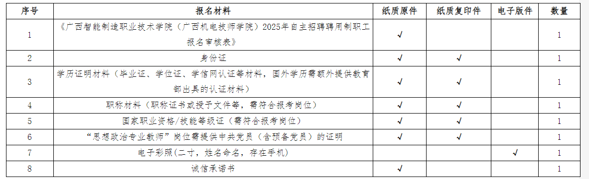 應(yīng)聘者按照招聘崗位具體要求對口報(bào)名,每名應(yīng)聘者限報(bào)一個(gè)崗位,采用現(xiàn)場報(bào)名遞交應(yīng)聘材料的方式報(bào)名。報(bào)名人員須下載并填寫《廣西智能制造職業(yè)技術(shù)學(xué)院(廣西機(jī)電技師學(xué)院)2025年自主招聘聘用制職工報(bào)名審核表》(附表2),同時(shí)需附上相應(yīng)的學(xué)歷、學(xué)位證書、身份證、職稱證書(相關(guān)崗位需要)等材料的原件與復(fù)印件(原件審核后退回,復(fù)印件不退回)