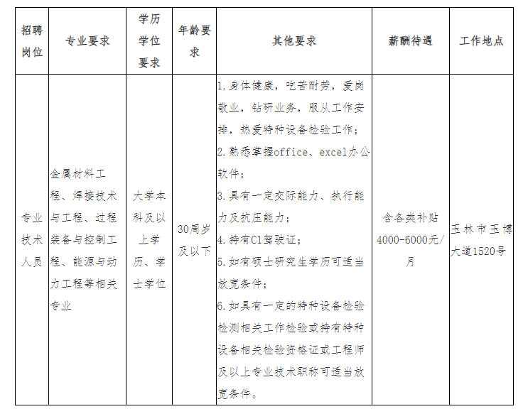 廣西壯族自治區(qū)特種設(shè)備檢驗(yàn)研究院玉林分院為廣西壯族自治區(qū)特種設(shè)備檢驗(yàn)研究院下屬分支機(jī)構(gòu),根據(jù)業(yè)務(wù)發(fā)展需要,現(xiàn)面向社會(huì)公開招聘編外聘用人員1名,崗位需求如下: