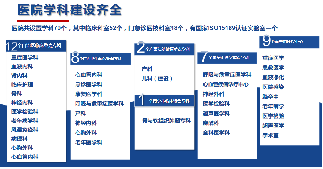 南寧市第一人民醫(yī)院(南寧市兒童先天性心血管疾病研究所、南寧市呼吸道疾病研究所、廣西醫(yī)科大學(xué)第五臨床醫(yī)學(xué)院、廣西醫(yī)科大學(xué)第五附屬醫(yī)院)始建于1914年,是一家擁有百年歷史的國家三級甲等綜合性醫(yī)院。醫(yī)院設(shè)有52個(gè)臨床病區(qū),18個(gè)門診醫(yī)技科室,總開放床位1912張(含分院)。醫(yī)院是國家高級認(rèn)知中心建設(shè)單位及國家神經(jīng)介入建設(shè)中心、國家ISO15189醫(yī)學(xué)檢驗(yàn)認(rèn)證機(jī)構(gòu),國家聯(lián)盟中心認(rèn)證的胸痛中心、卒中中心;擁有廣西臨床重點(diǎn)??疲ê嘤?2個(gè)、自治區(qū)醫(yī)療衛(wèi)生重點(diǎn)學(xué)科(含培育)8個(gè)、自治區(qū)婦幼健康服務(wù)重點(diǎn)學(xué)科(含建設(shè))2個(gè)、南寧市醫(yī)學(xué)重點(diǎn)學(xué)科7個(gè)、南寧市臨床特色優(yōu)勢???個(gè),南寧市質(zhì)控中心9個(gè)。醫(yī)院是國家衛(wèi)健委創(chuàng)面修復(fù)能力建設(shè)和繼續(xù)教育中心教學(xué)基地、國家級住院醫(yī)師規(guī)范化培訓(xùn)培訓(xùn)基地,廣西醫(yī)科大學(xué)碩士研究生培養(yǎng)基地,同時(shí)是暨南大學(xué)共建醫(yī)學(xué)教育基地、第十批廣西博士后創(chuàng)新實(shí)踐基地;醫(yī)院還具備國家藥物臨床試驗(yàn)機(jī)構(gòu)資質(zhì)(含I期研究室);醫(yī)院醫(yī)學(xué)實(shí)驗(yàn)中心獲批廣西科技廳重點(diǎn)實(shí)驗(yàn)室“廣西智慧精準(zhǔn)醫(yī)學(xué)實(shí)驗(yàn)室”,是南寧市衛(wèi)健系統(tǒng)唯一的省級重點(diǎn)建設(shè)實(shí)驗(yàn)室。2019年在市委市政府支持下,成立南寧市第一人民醫(yī)院醫(yī)療集團(tuán)。現(xiàn)有27家成員單位,形成“1+4+22”(中心醫(yī)院+4家二級醫(yī)院+22家基層衛(wèi)生及養(yǎng)老機(jī)構(gòu))一體化格局,推行“三二一”運(yùn)營管理模式,逐步構(gòu)建全生命周期健康管理鏈。