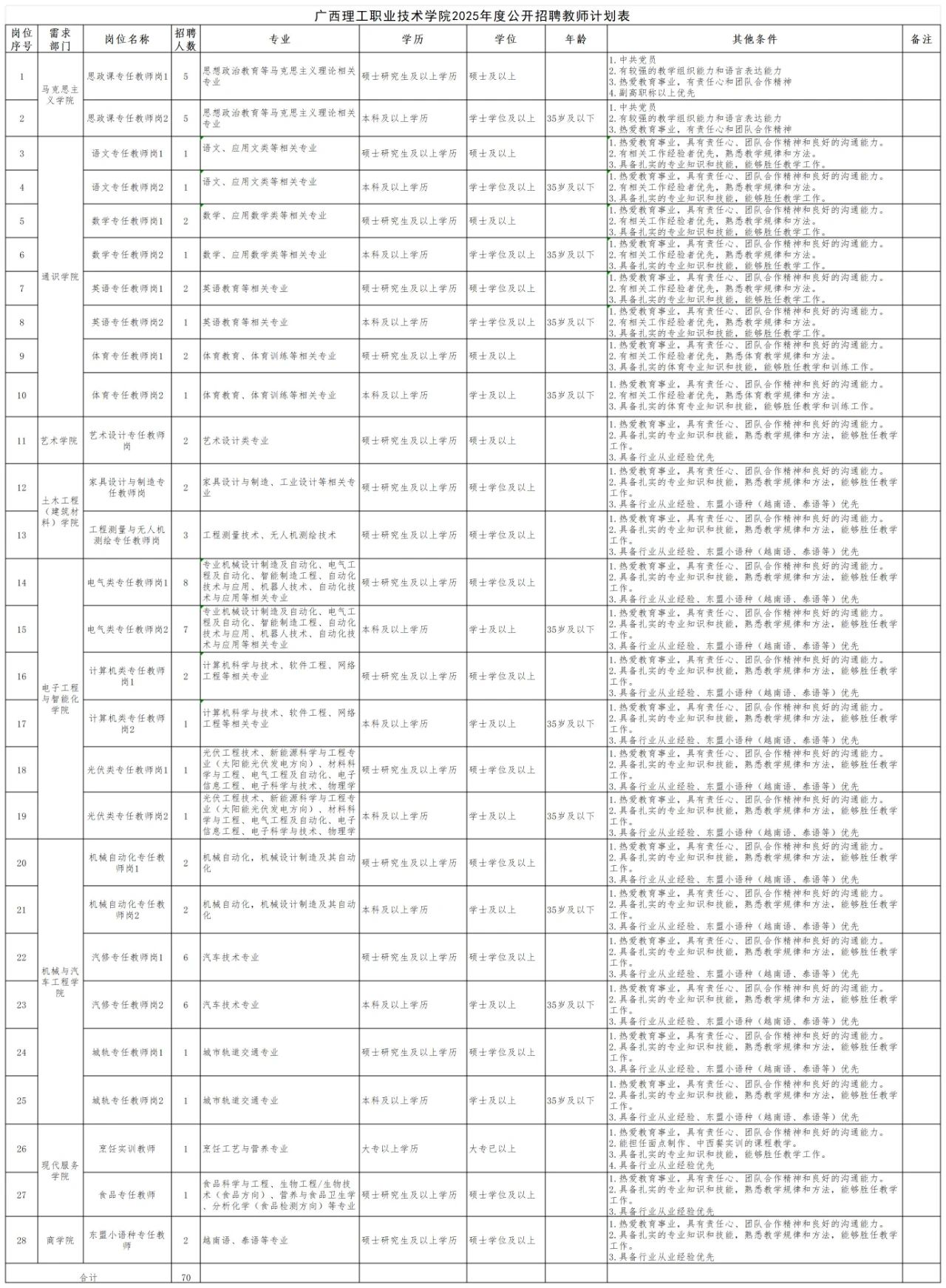 詳見《廣西理工職業(yè)技術(shù)學院2025年度公開招聘教師計劃表》