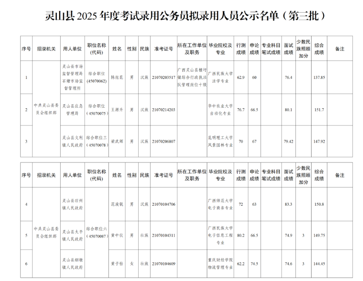 根據(jù)《廣西壯族自治區(qū)2025年度考試錄用公務(wù)員公告》等有關(guān)規(guī)定,經(jīng)過公開報名、資格審查、筆試、面試、體檢、考察等程序,擬錄用陳炫昆等6位同志(附件)為公務(wù)員,現(xiàn)予以公示。公示期5個工作日,如對擬錄用人員的錄用資格有異議,請在公示期內(nèi)向中共靈山縣委員會組織部干部監(jiān)督室實名反映。