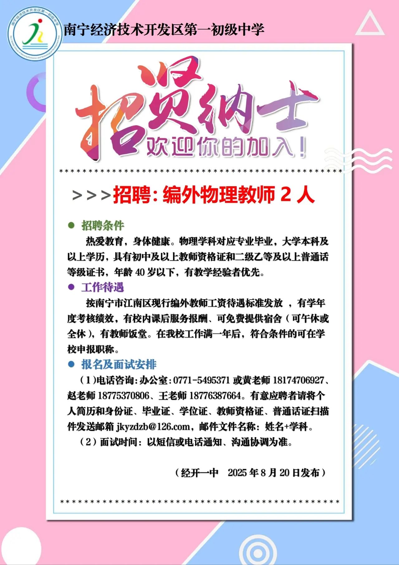2025年南寧經(jīng)濟(jì)技術(shù)開發(fā)區(qū)第一初級(jí)中學(xué)招聘物理教師