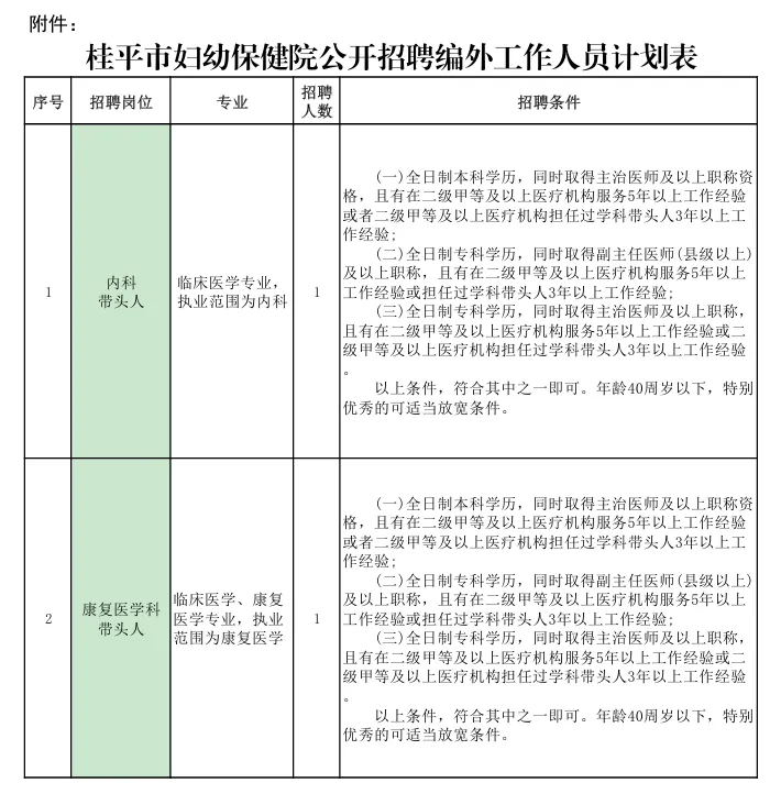 詳見《桂平市婦幼保健院公開招聘編外工作人員計劃表》(附件)