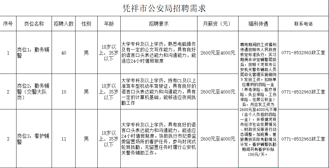 被聘用人員試用期為兩個月,試用期應(yīng)發(fā)工資為2600元/月(含個人負擔的四險一金)。期滿不能勝任工作崗位者,不再聘用;不滿一月的按日均計算報酬;輔警享受帶薪年休假、年度健康檢查、人身意外傷害保險等待遇。五、聯(lián)系方式:1、憑祥市公安局政工室 0771-85329632、憑祥市公安局交警大隊辦公室 0771-8521081