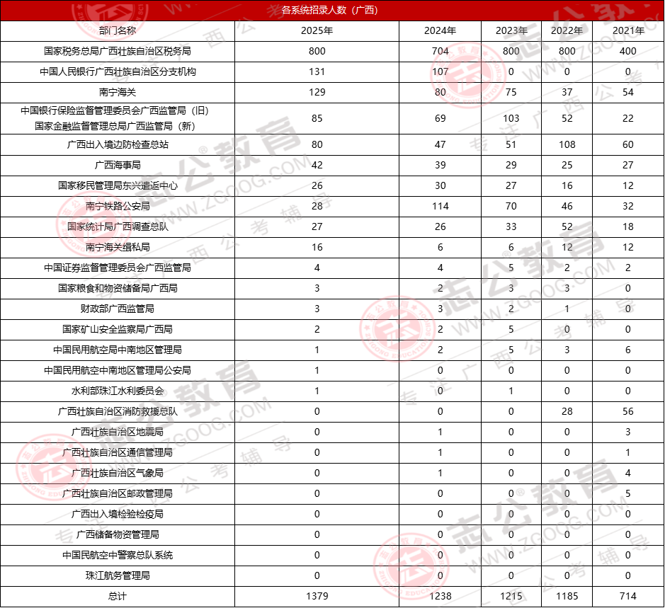 國(guó)家稅務(wù)總局廣西壯族自治區(qū)稅務(wù)局常年占據(jù)招錄首位,2025年以376個(gè)崗位、800人的招錄規(guī)模,占廣西總招錄人數(shù)的58%。此外,海關(guān)系統(tǒng)對(duì)廣西考生較為友好,平均入面分?jǐn)?shù)約117分,比稅務(wù)系統(tǒng)低5分以上,且常面向冷門專業(yè)招錄,可作為特色選擇。