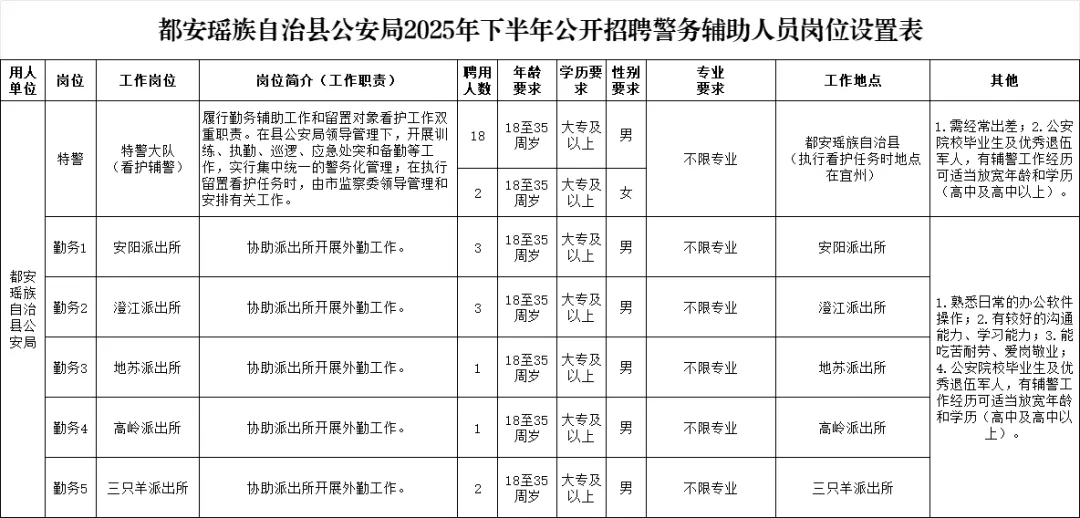 都安瑤族自治縣公安局本次擬招聘警務(wù)輔助人員30人,具體招聘崗位、人數(shù)、資格條件詳見《都安瑤族自治縣公安局2025年下半年公開招聘警務(wù)輔助人員崗位設(shè)置表》。