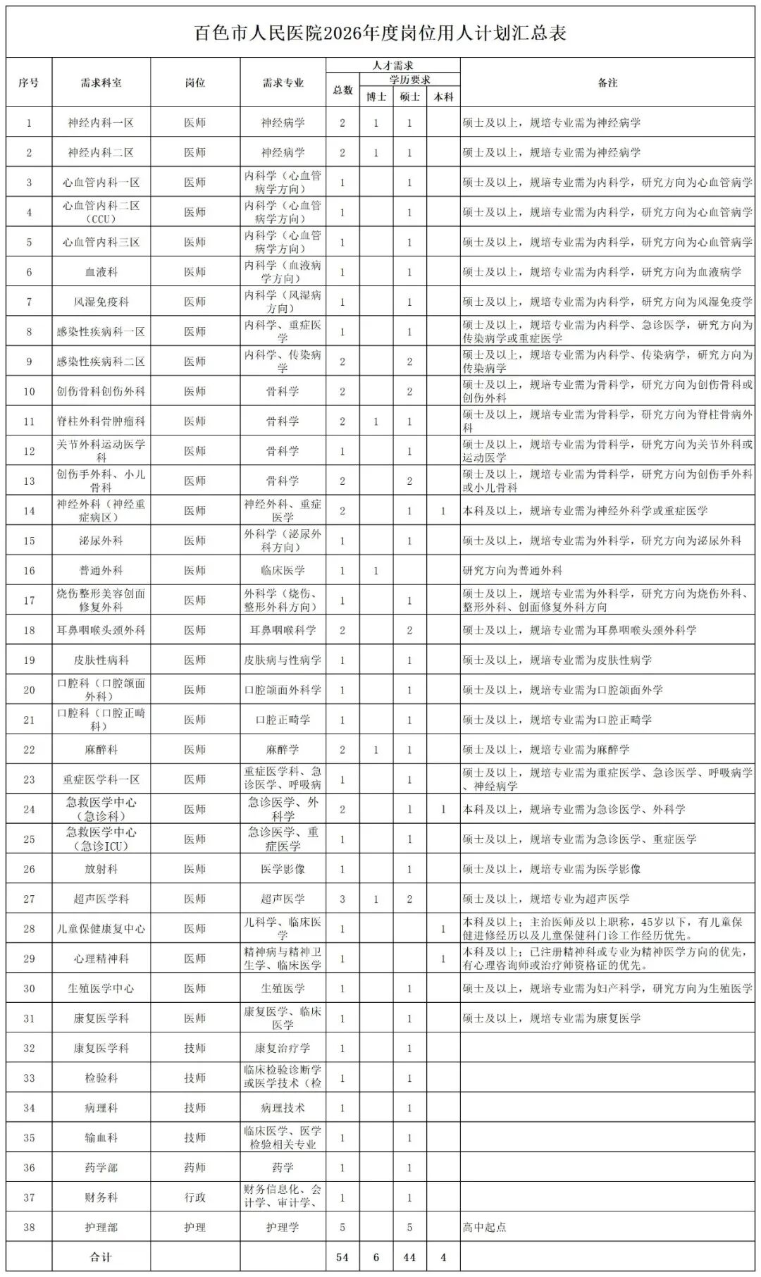 應(yīng)聘者到百色市人民醫(yī)院組織人事科(百色市右江區(qū)城鄉(xiāng)路8號醫(yī)技綜合樓三樓行政辦公區(qū)組織人事科)現(xiàn)場投遞簡歷,或到區(qū)內(nèi)各醫(yī)學(xué)院校雙選會(huì)現(xiàn)場投遞簡歷,不接受網(wǎng)上投遞簡歷報(bào)名。簡歷包括報(bào)名登記表、個(gè)人簡歷、身份證、畢業(yè)證、學(xué)位證、職稱證、執(zhí)業(yè)證、住院醫(yī)師規(guī)范化培訓(xùn)合格證書、英語等級證書、論文發(fā)表、科研成果、獎(jiǎng)項(xiàng)榮譽(yù)等相關(guān)材料。