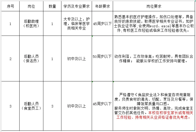 3.具有相應(yīng)崗位文化程度,身體健康、手腳敏捷、具有團隊合作精神,能服從學校安排及管理。