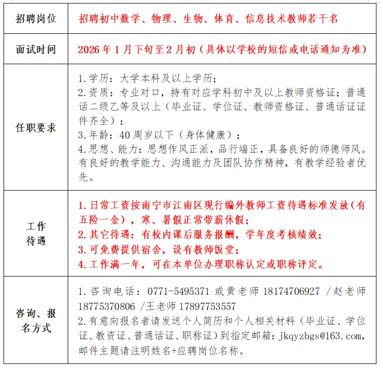 原文標(biāo)題:南寧經(jīng)濟(jì)技術(shù)開發(fā)區(qū)第一初級(jí)中學(xué)2026年春季學(xué)期教師招聘公告