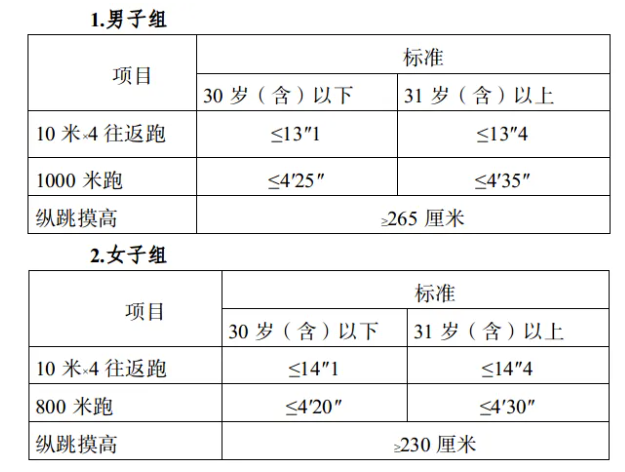 參照《關于印發(fā)<公安機關錄用人民警察體能測評項目和標準>的通知》(公政治〔2024〕60號)執(zhí)行,每個測評項目分別記錄成績。其中縱跳摸高的測評次數不超過3次,10米×4往返跑測評次數不超過2次,男子1000米跑、女子800米跑測評次數均為1次。