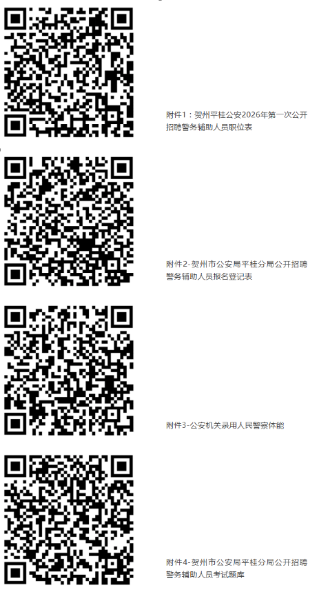 報考人員自2026年1月26日起,可通過賀州市公共就業(yè)和人才服務中心“賀州市微就業(yè)”官方微信(gxhzjy)、賀州市公安局平桂分局“平桂警方”官方微信(pggafj)查閱招聘簡章及《職位計劃表》(附件1)等相關招聘信息。