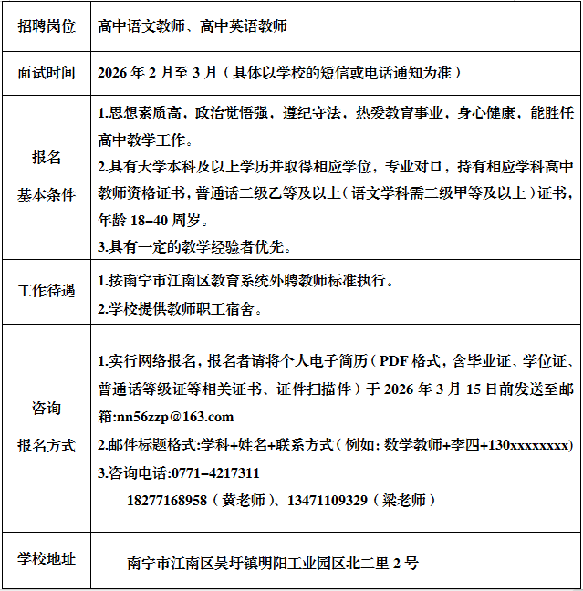 原文標題:南寧市第五十六中學(xué)2026年春季學(xué)期編外教師招聘公告