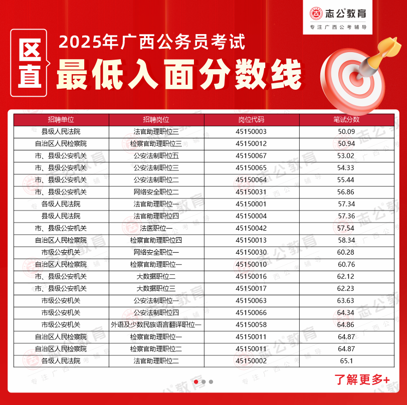 2025年廣西公務(wù)員考試筆試成績及面試入圍名單已公布。為幫助考生了解各單位招錄情況,本文根據(jù)官方發(fā)布的面試資格審查公告,整理了部分區(qū)直單位的進(jìn)面分?jǐn)?shù)數(shù)據(jù),供廣大考生在備考過程中進(jìn)行參考。