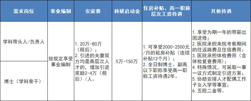 待遇參照國(guó)家事業(yè)單位標(biāo)準(zhǔn)或按照醫(yī)院相關(guān)規(guī)定執(zhí)行,根據(jù)不同人員類別給予5萬(wàn)元至10萬(wàn)元(稅后)安家補(bǔ)助獎(jiǎng)勵(lì),具體內(nèi)容請(qǐng)仔細(xì)閱讀招聘公告。