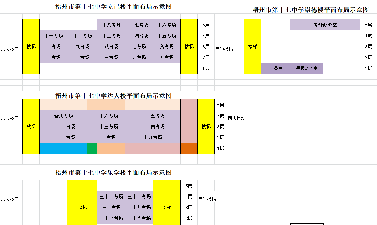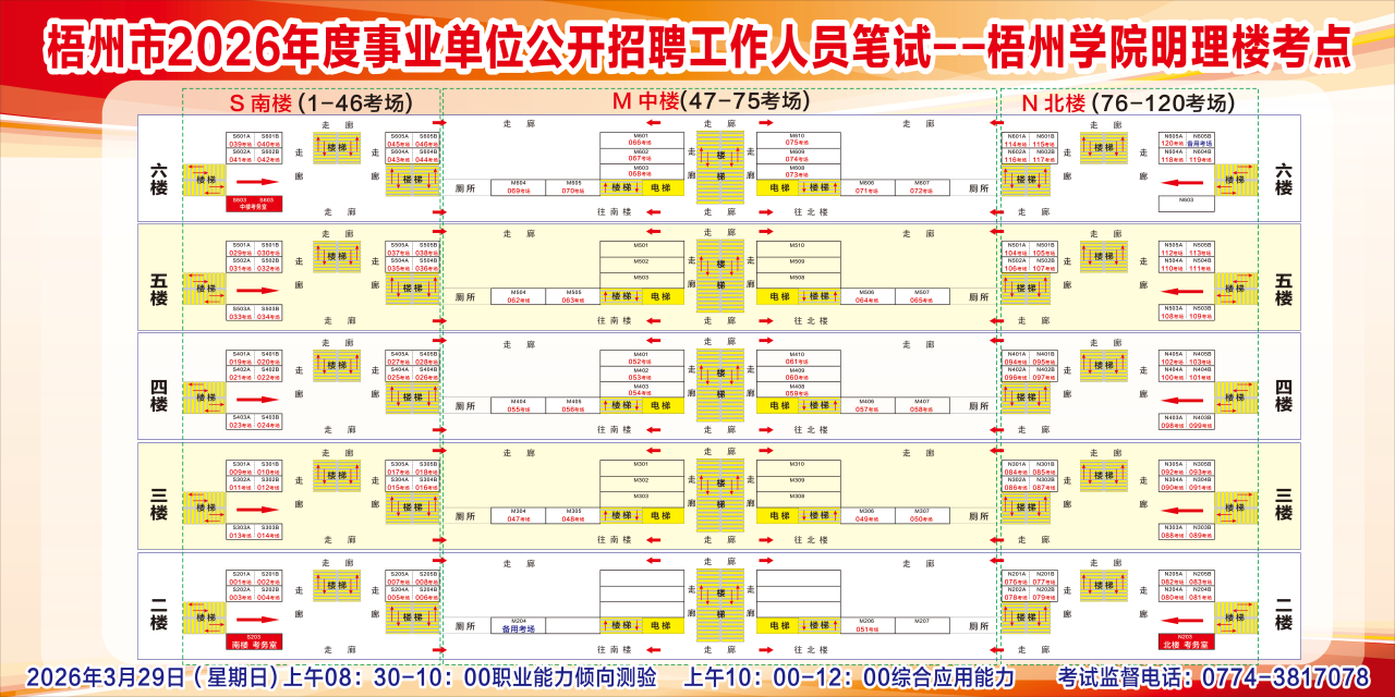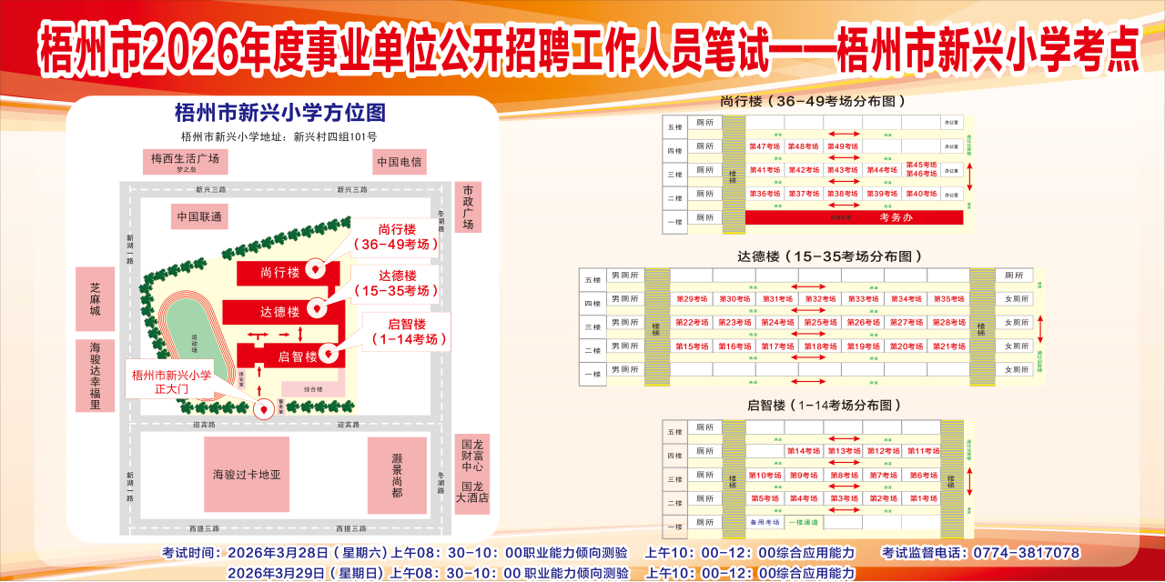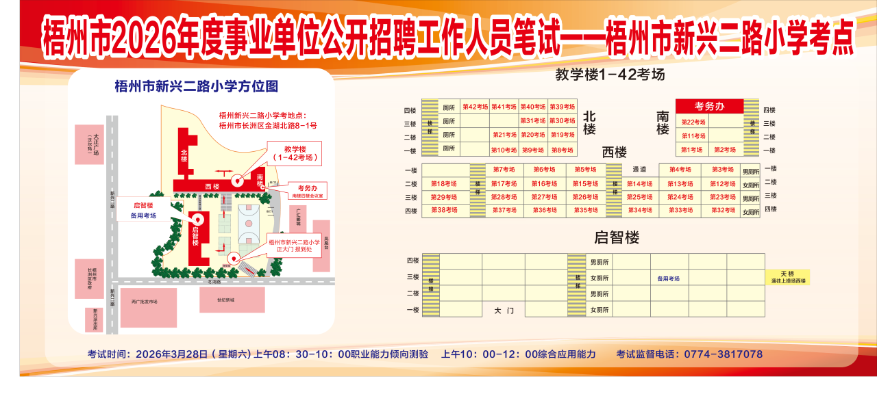 梧州考區(qū)3月28日綜合管理(A類)考試的考點學(xué)校:三中、四中、五中、十五中、十七中、新興小學(xué)、新興二路小學(xué)。3月29日社會科學(xué)專技(B類)、自然科學(xué)專技(C類)、中小學(xué)教師(D類)和醫(yī)療衛(wèi)生(E類)考試的考點學(xué)校:一中高中部、三中、四中、五中、七中、十五中、十七中、梧州高中、梧州學(xué)院明理教學(xué)樓、新興小學(xué)、新興二路小學(xué)。