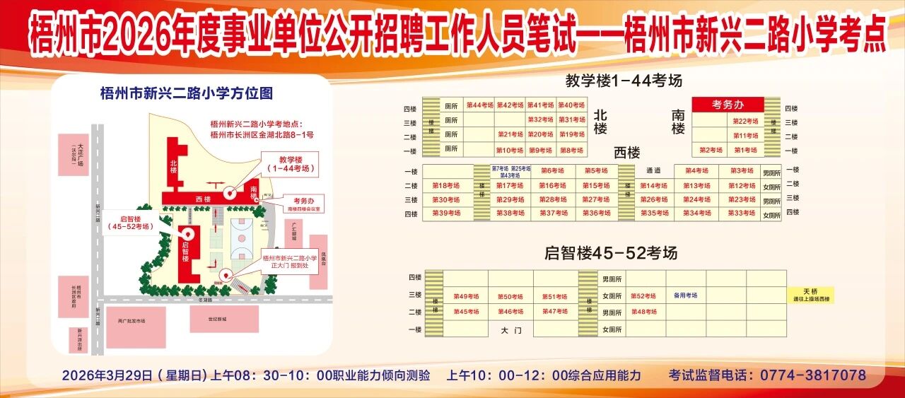請考生提前熟悉各自考點位置、周邊環(huán)境及交通情況,考試當(dāng)天提前出門做好準(zhǔn)備,準(zhǔn)時參加考試。特別提示:因考點停車場地有限,所有考生車輛不得進入考點,請考生規(guī)劃好前往考點的交通方式和路線。此外,萬秀區(qū)西堤二路新華路口至豐業(yè)藍天港灣段、長洲區(qū)西堤三路梧州市人力資源和社會保障局至奧奇麗路口段道路實施臨時交通管制措施,如果考生通往考點途經(jīng)此路段,請?zhí)崆耙?guī)劃路線和出行時間。