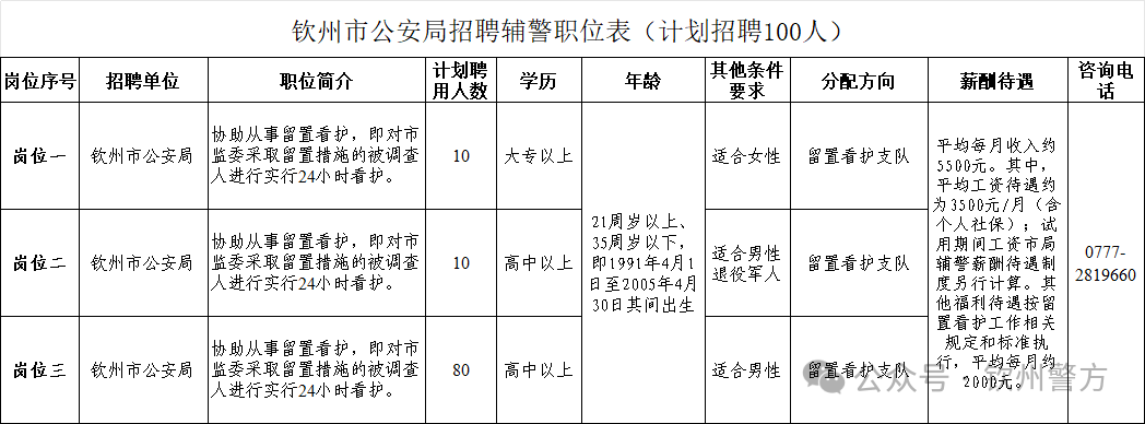 崗位三:80人,市公安局留置看護(hù)輔警崗位,適合男性,高中(含中專)以上學(xué)歷。